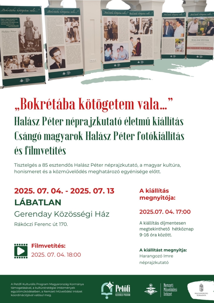 Szeretettel hívunk minden érdeklődőt 2025. július 4-én a Gerenday Közösségi Házba, ahol 17 órakor Harangozó Imre néprajzkutató, a kiállítás kurátora megnyitja a „Bokrétába kötögetem vala” című Halász Péter néprajzkutató életmű kiállítását, valamint a Csángó magyarokról szóló Halász Péter fotókiállítást! Majd a megnyitót követően 18 órától a rendezvényteremben a csángó magyarokról szóló filmvetítésre invitáljuk Önöket!