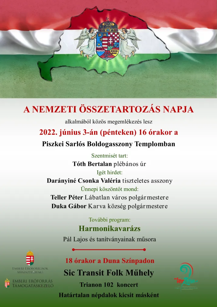 A Nemzeti Összetartozás Napja alkalmából közös megemlékezésre hívjuk Lábatlan lakosságát 2022. június 3 – án, pénteken, 16 órától a piszkei Sarlós Boldogasszony templomban lévő közös megemlékezésre, majd 18 órától a Duna Színpadhoz, ahol a Sic Transit Folk Műhely ad koncertet Trianon 102 címmel.