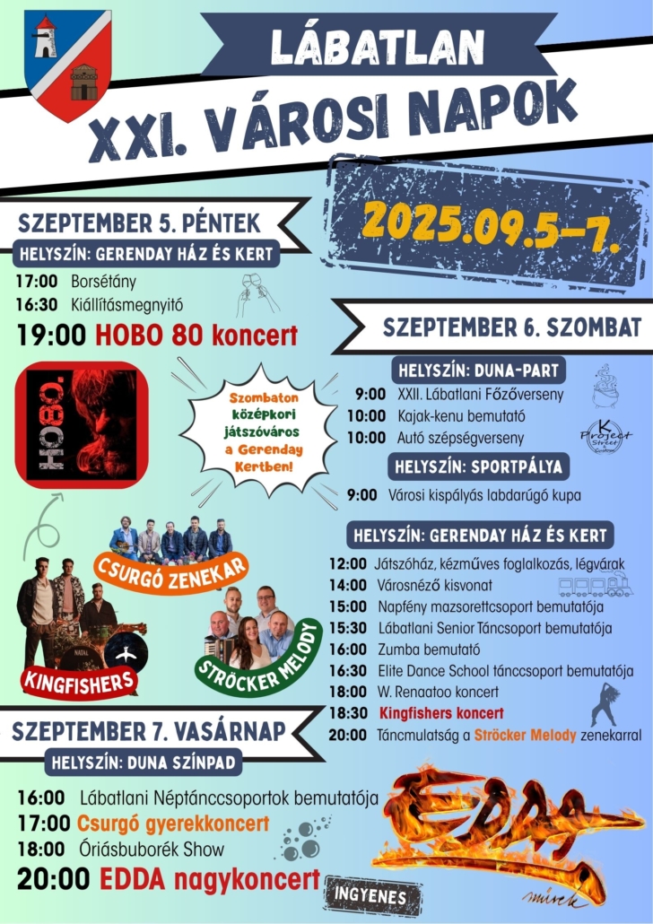 A háromnapos ünnepség méltó lezárásaként este egy monumentális nagyszínpadi produkció következik. A Duna-parton – a megszokott, professzionális hang- és fénytechnikával felszerelt színpadon – érkezik városunkba az EDDA Művek! Számíthattok a legnagyobb slágerekre, mint a Kör közepén, Minden sarkon álltam már, Éjjel érkezem – és még sok más, amelyet együtt énekelhetünk Pataky Attilával és zenekarával.