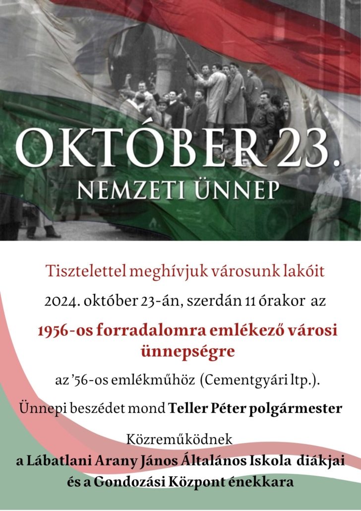 Tisztelettel meghívjuk városunk lakóit 2024. október 23- án, szerdán, 11 órakor az 1956-os forradalomra emlékező VÁROSI ÜNNEPSÉGRE, az 56′-os emlékműhöz! (Cementgyári ltp. , posta mögött)